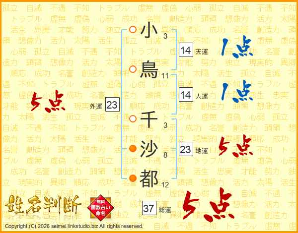小鳥千沙都さんの総運は37画の5点!