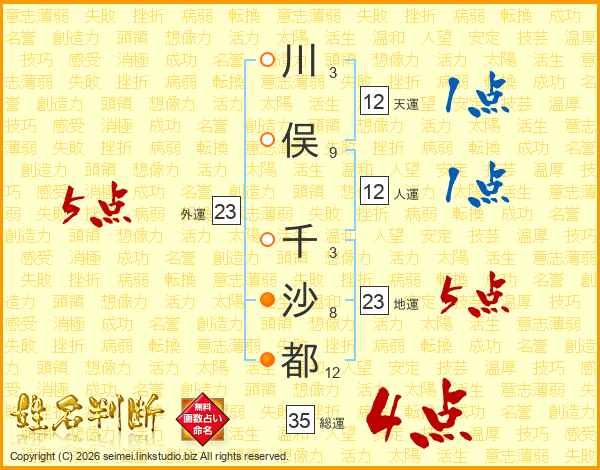 生活面を象徴する運勢です。外部から受ける影響力を表し、結婚運、家庭運や職場、環境への順応性を表します。総運から人運を引いた画数。姓や名が1文字の場合を除く。
