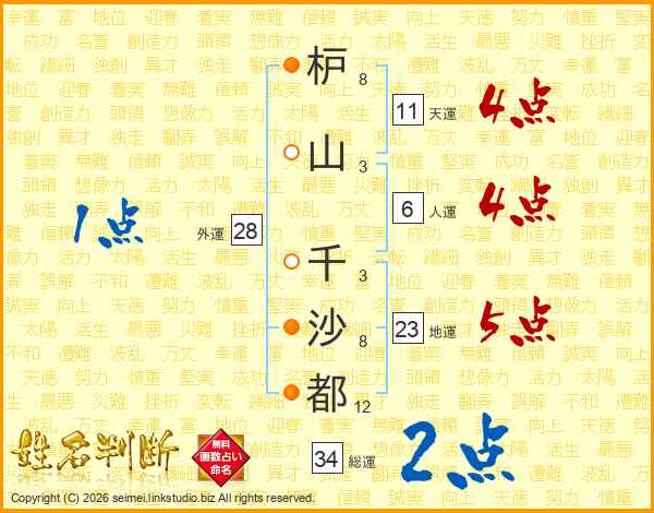 枦山千沙都さんの総運は34画の2点!