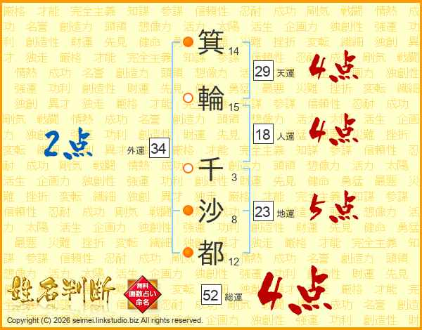 箕(14画)輪(15画) 千(3画)沙(8画)都(12画)