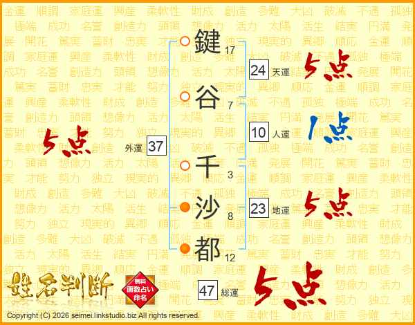鍵(17画)谷(7画) 千(3画)沙(8画)都(12画)