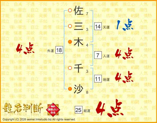佐(7画)三(3画)木(4画) 千(3画)沙(8画)