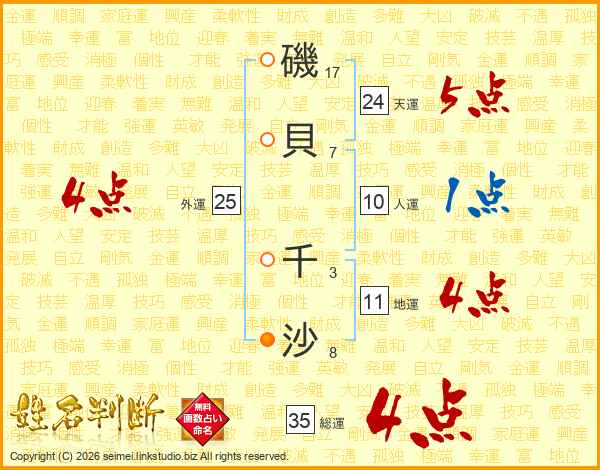 磯(17画)貝(7画) 千(3画)沙(8画)