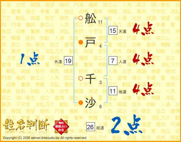 舩(11画)戸(4画) 千(3画)沙(8画)