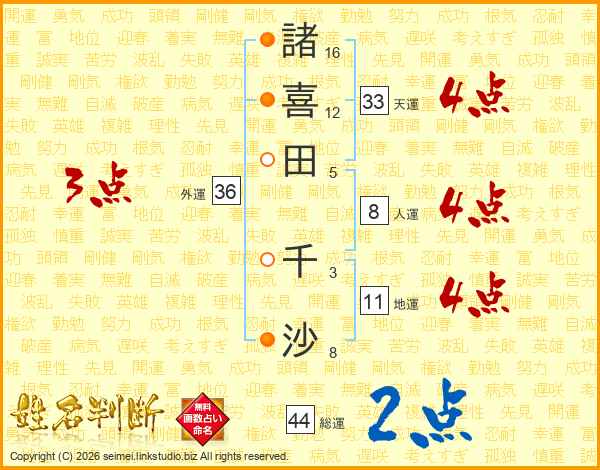 諸(16画)喜(12画)田(5画) 千(3画)沙(8画)