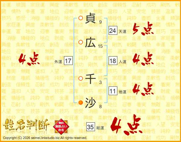 貞(9画)広(15画) 千(3画)沙(8画)