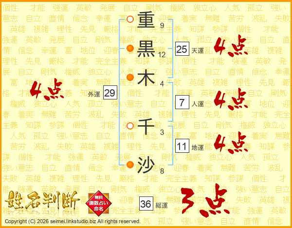 重(9画)黒(12画)木(4画) 千(3画)沙(8画)