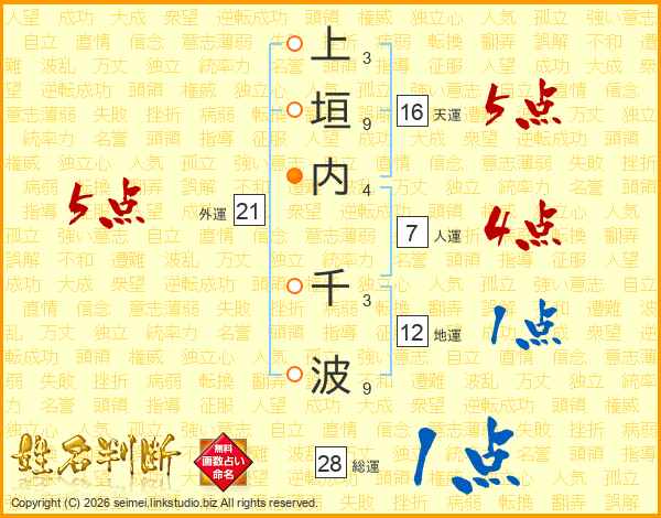 上(3画)垣(9画)内(4画) 千(3画)波(9画)