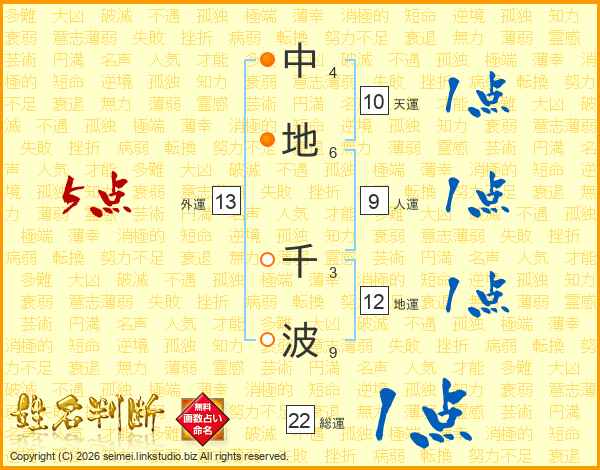 生活面を象徴する運勢です。外部から受ける影響力を表し、結婚運、家庭運や職場、環境への順応性を表します。総運から人運を引いた画数。姓や名が1文字の場合を除く。