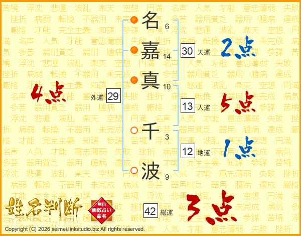名(6画)嘉(14画)真(10画) 千(3画)波(9画)