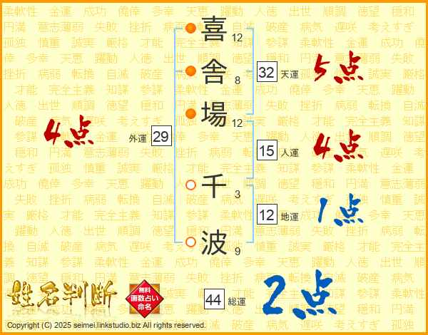喜(12画)舎(8画)場(12画) 千(3画)波(9画)