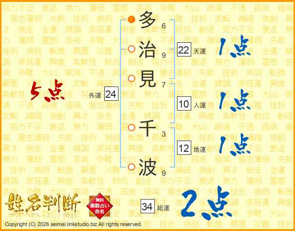 多(6画)治(9画)見(7画) 千(3画)波(9画)