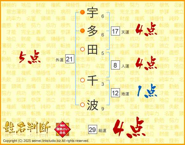 宇(6画)多(6画)田(5画) 千(3画)波(9画)