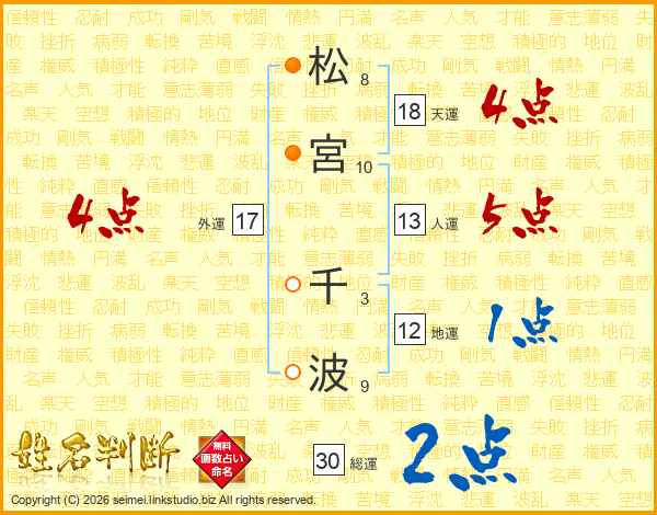 生活面を象徴する運勢です。外部から受ける影響力を表し、結婚運、家庭運や職場、環境への順応性を表します。総運から人運を引いた画数。姓や名が1文字の場合を除く。
