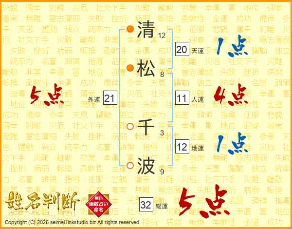 生活面を象徴する運勢です。外部から受ける影響力を表し、結婚運、家庭運や職場、環境への順応性を表します。総運から人運を引いた画数。姓や名が1文字の場合を除く。
