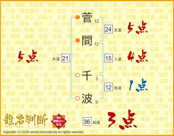 菅(12画)間(12画) 千(3画)波(9画)