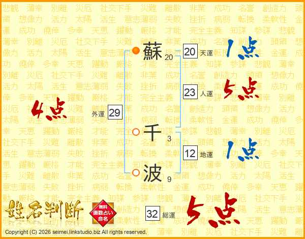 生活面を象徴する運勢です。外部から受ける影響力を表し、結婚運、家庭運や職場、環境への順応性を表します。総運から人運を引いた画数。姓や名が1文字の場合を除く。