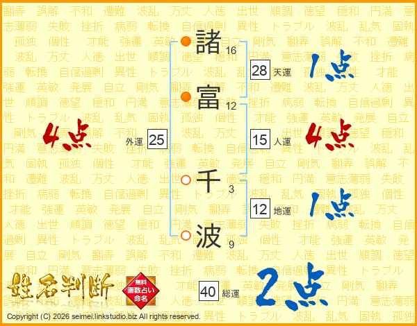 諸(16画)富(12画) 千(3画)波(9画)