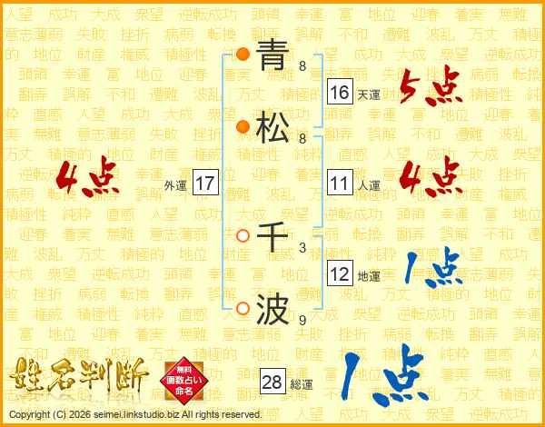 青(8画)松(8画) 千(3画)波(9画)