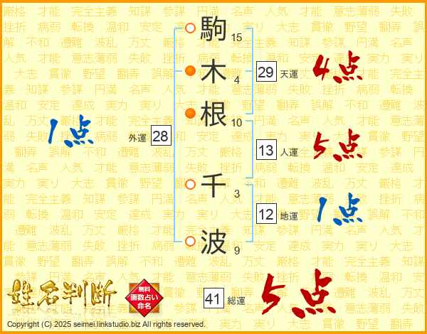 駒(15画)木(4画)根(10画) 千(3画)波(9画)