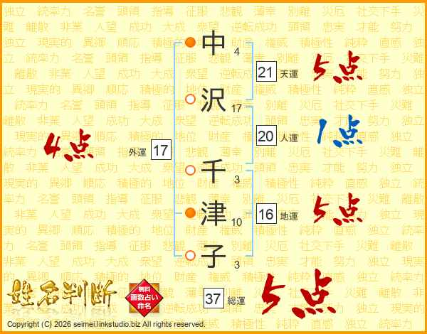 中(4画)沢(17画) 千(3画)津(10画)子(3画)