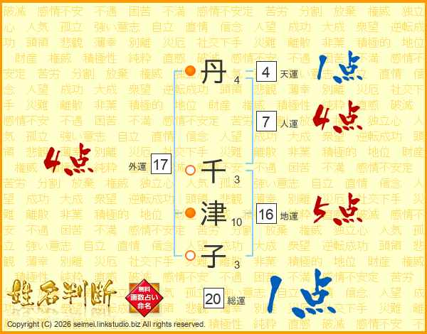 生活面を象徴する運勢です。外部から受ける影響力を表し、結婚運、家庭運や職場、環境への順応性を表します。総運から人運を引いた画数。姓や名が1文字の場合を除く。