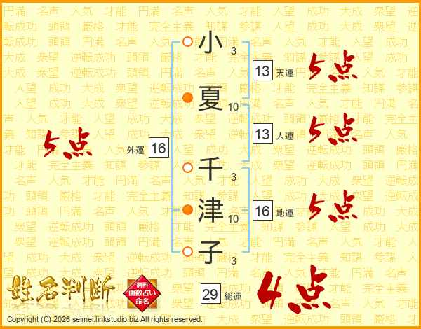 小夏千津子さんの総運は29画の4点!