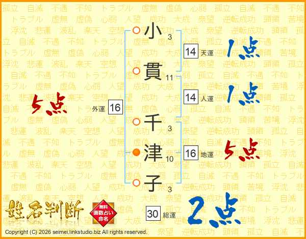 小(3画)貫(11画) 千(3画)津(10画)子(3画)