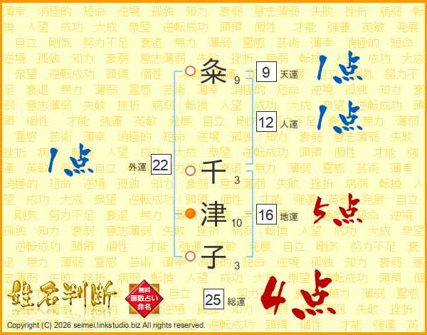 生活面を象徴する運勢です。外部から受ける影響力を表し、結婚運、家庭運や職場、環境への順応性を表します。総運から人運を引いた画数。姓や名が1文字の場合を除く。