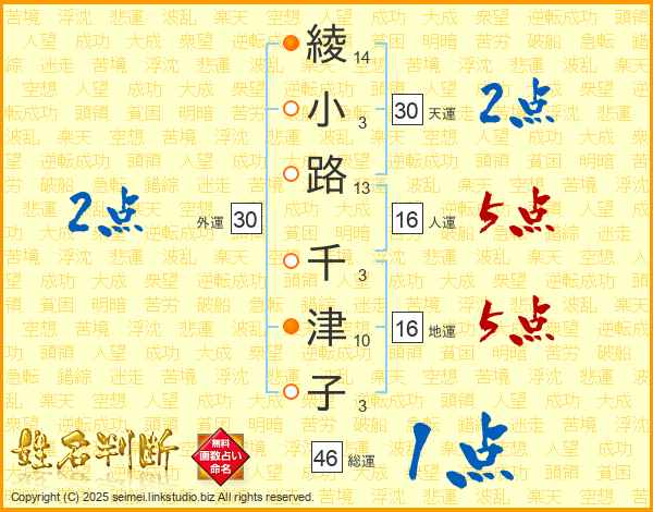 綾(14画)小(3画)路(13画) 千(3画)津(10画)子(3画)