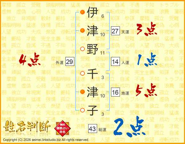 伊(6画)津(10画)野(11画) 千(3画)津(10画)子(3画)