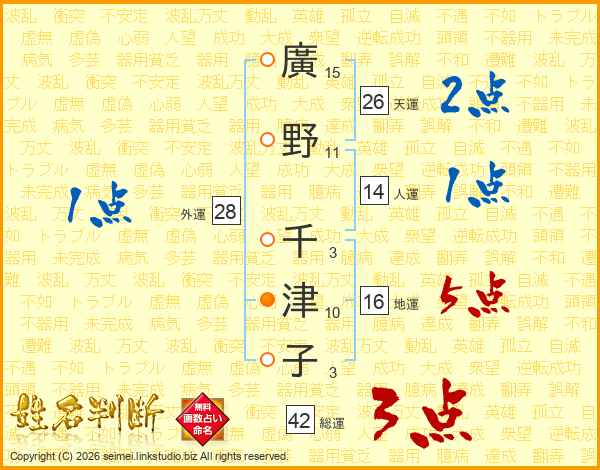 廣野千津子さんの天運は26画の2点!