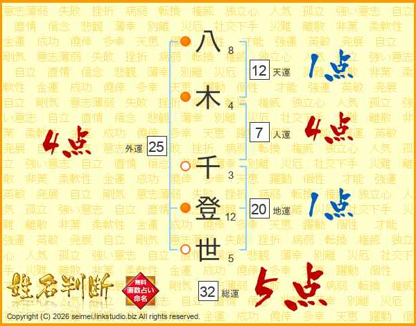 生活面を象徴する運勢です。外部から受ける影響力を表し、結婚運、家庭運や職場、環境への順応性を表します。総運から人運を引いた画数。姓や名が1文字の場合を除く。