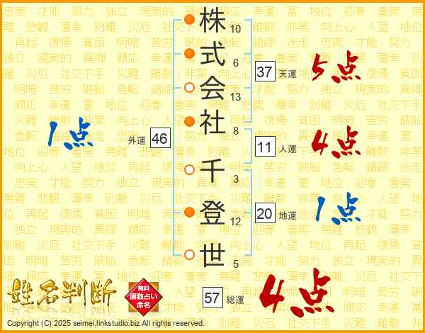 株(10画)式(6画)会(13画)社(8画) 千(3画)登(12画)世(5画)