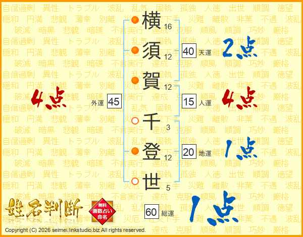 横(16画)須(12画)賀(12画) 千(3画)登(12画)世(5画)