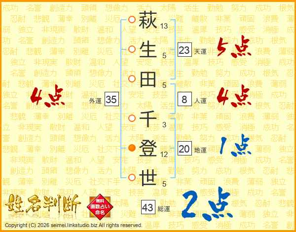 萩(13画)生(5画)田(5画) 千(3画)登(12画)世(5画)