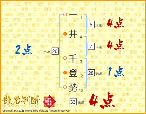 生活面を象徴する運勢です。外部から受ける影響力を表し、結婚運、家庭運や職場、環境への順応性を表します。総運から人運を引いた画数。姓や名が1文字の場合を除く。