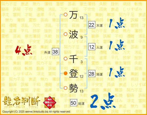 生活面を象徴する運勢です。外部から受ける影響力を表し、結婚運、家庭運や職場、環境への順応性を表します。総運から人運を引いた画数。姓や名が1文字の場合を除く。