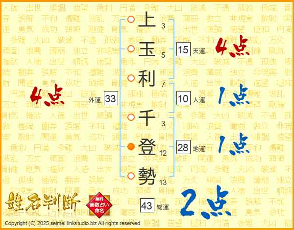 上(3画)玉(5画)利(7画) 千(3画)登(12画)勢(13画)