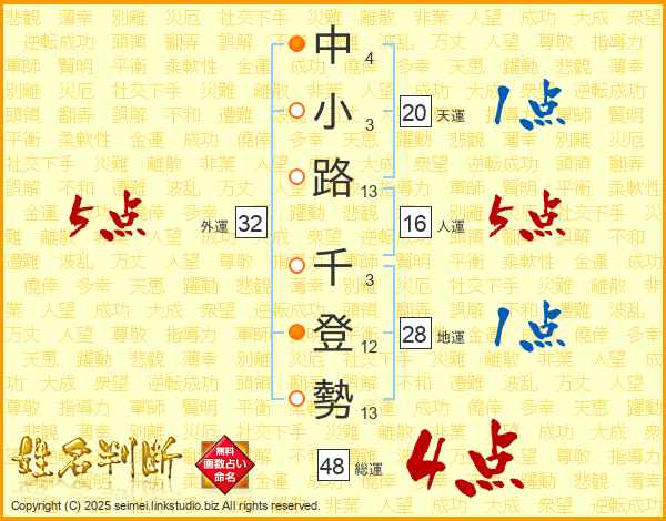 生活面を象徴する運勢です。外部から受ける影響力を表し、結婚運、家庭運や職場、環境への順応性を表します。総運から人運を引いた画数。姓や名が1文字の場合を除く。