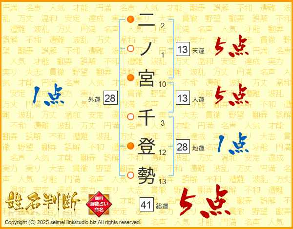二(2画)ノ(1画)宮(10画) 千(3画)登(12画)勢(13画)