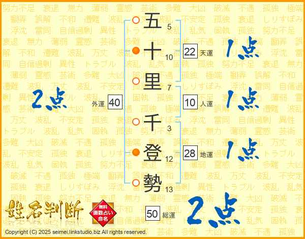 生活面を象徴する運勢です。外部から受ける影響力を表し、結婚運、家庭運や職場、環境への順応性を表します。総運から人運を引いた画数。姓や名が1文字の場合を除く。