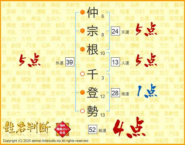 仲宗根千登勢さんの外運は39画の5点!