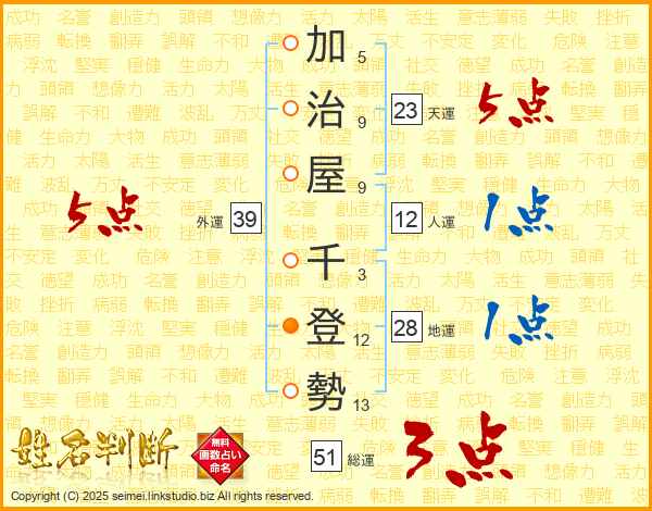 加(5画)治(9画)屋(9画) 千(3画)登(12画)勢(13画)