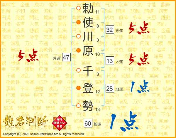 勅(11画)使(8画)川(3画)原(10画) 千(3画)登(12画)勢(13画)