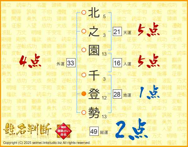 北(5画)之(3画)園(13画) 千(3画)登(12画)勢(13画)