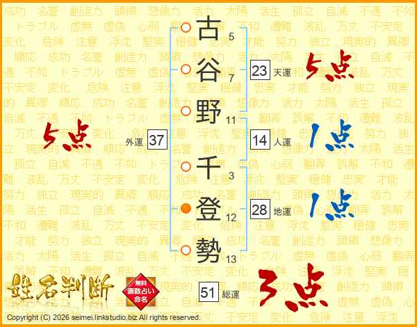 古(5画)谷(7画)野(11画) 千(3画)登(12画)勢(13画)