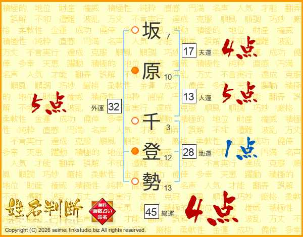 坂(7画)原(10画) 千(3画)登(12画)勢(13画)