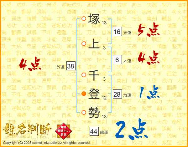 塚(13画)上(3画) 千(3画)登(12画)勢(13画)