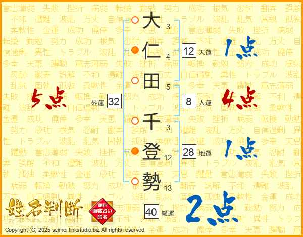 大(3画)仁(4画)田(5画) 千(3画)登(12画)勢(13画)